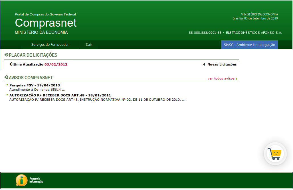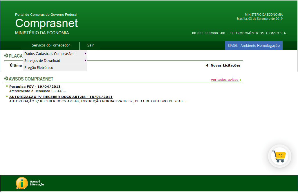 Clique em "Comprasnet - SIASG", faça "Login", como fornecedor. Passe o mouse na aba "Serviços do Fornecedor".