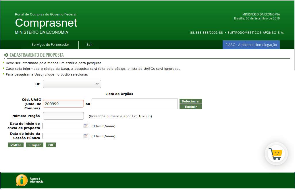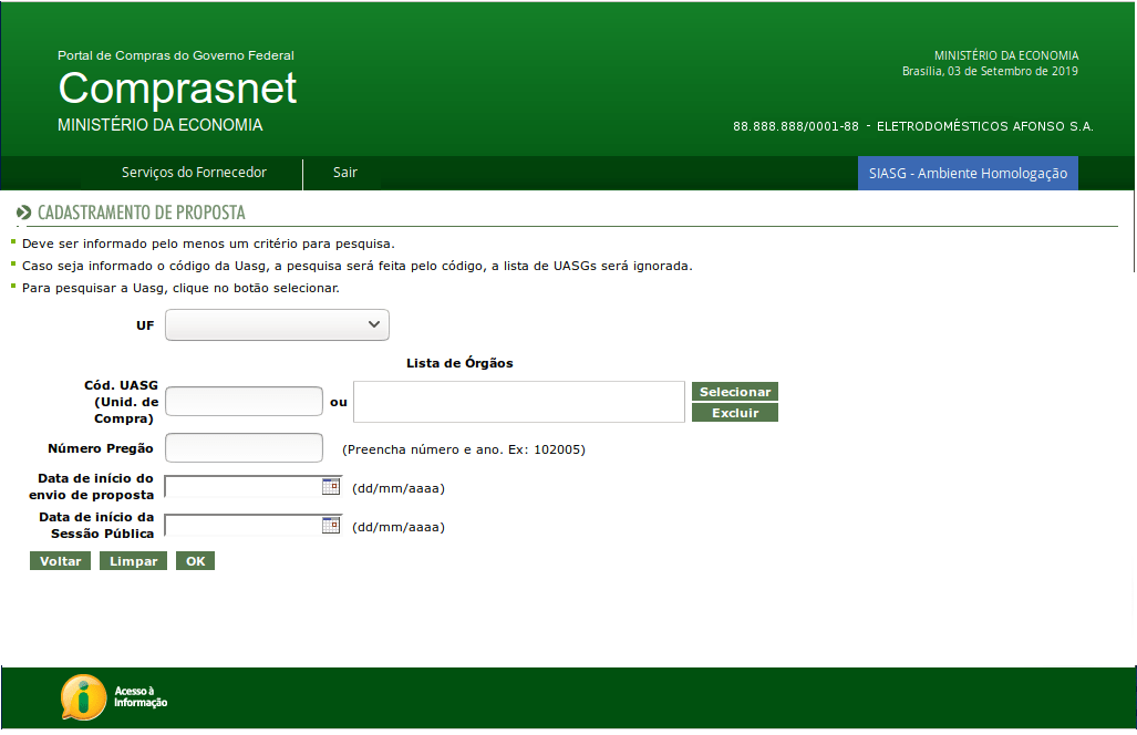 Para este exemplo, localize o pregão para o qual você precisa encaminhar a proposta usando o Código da UASG.