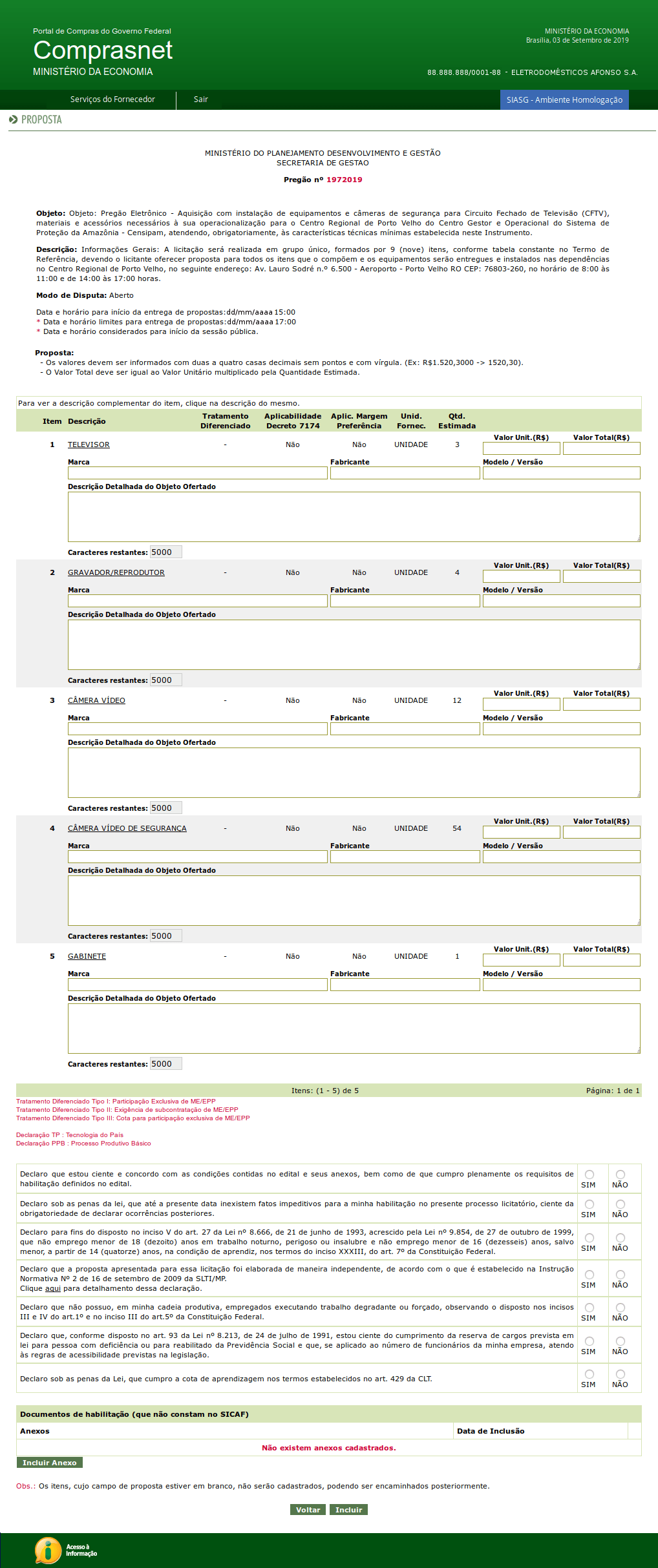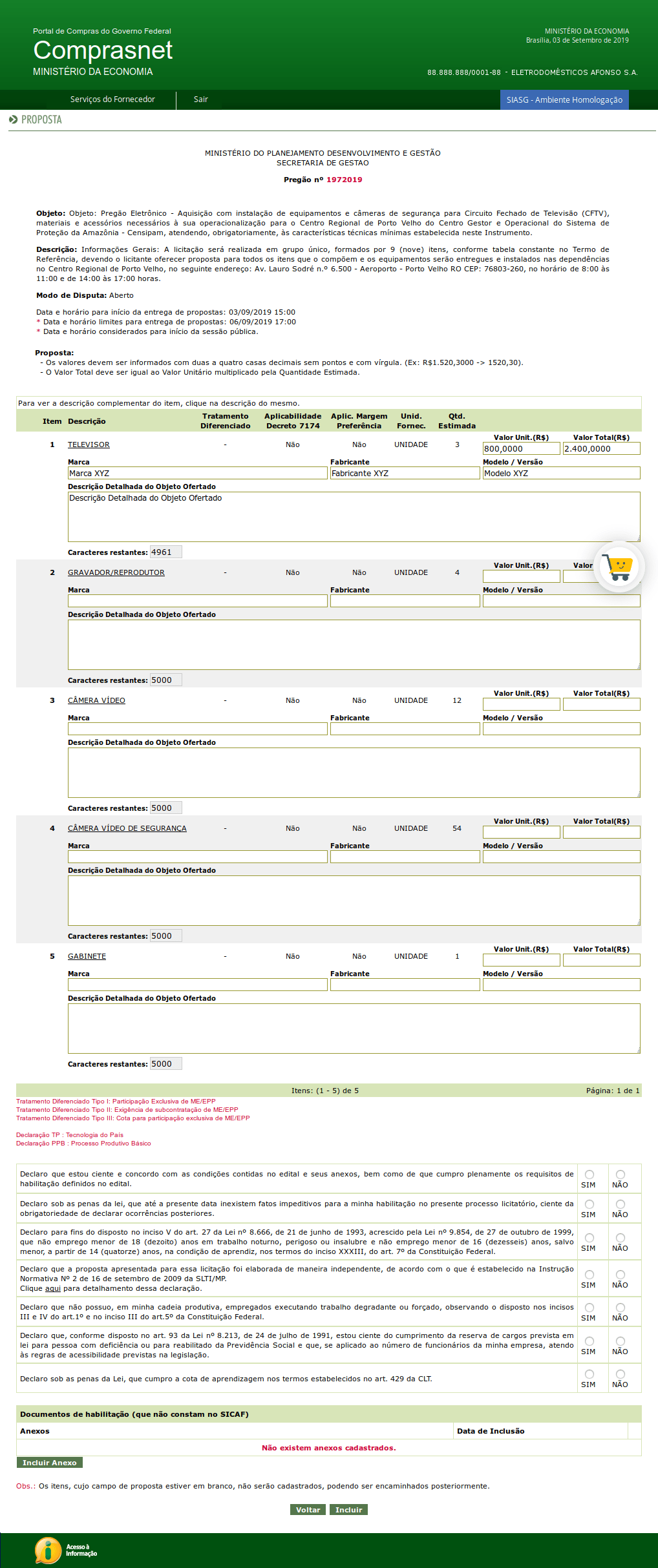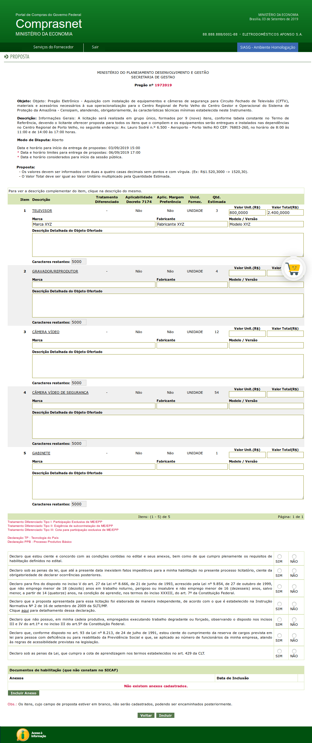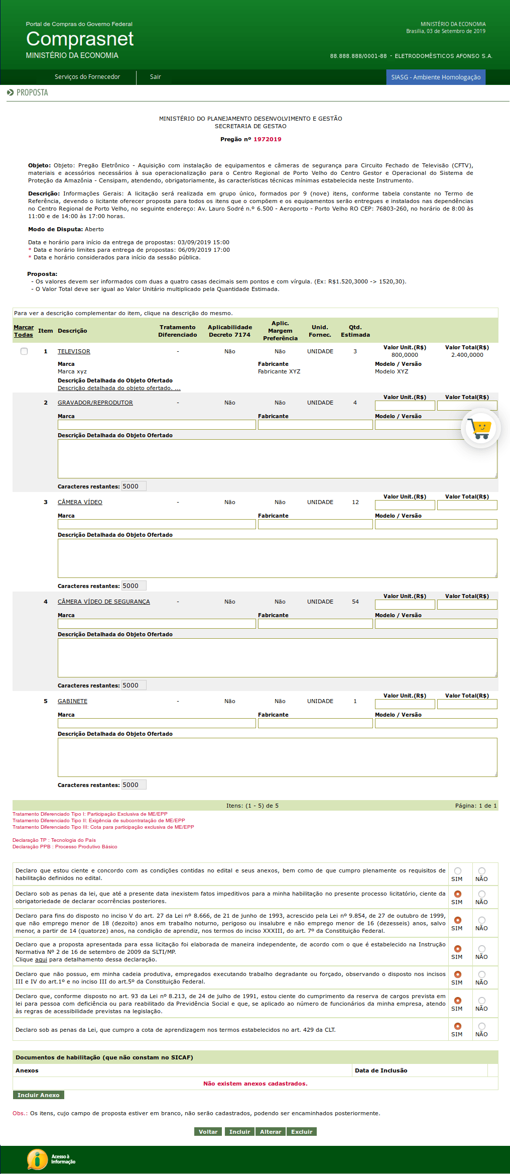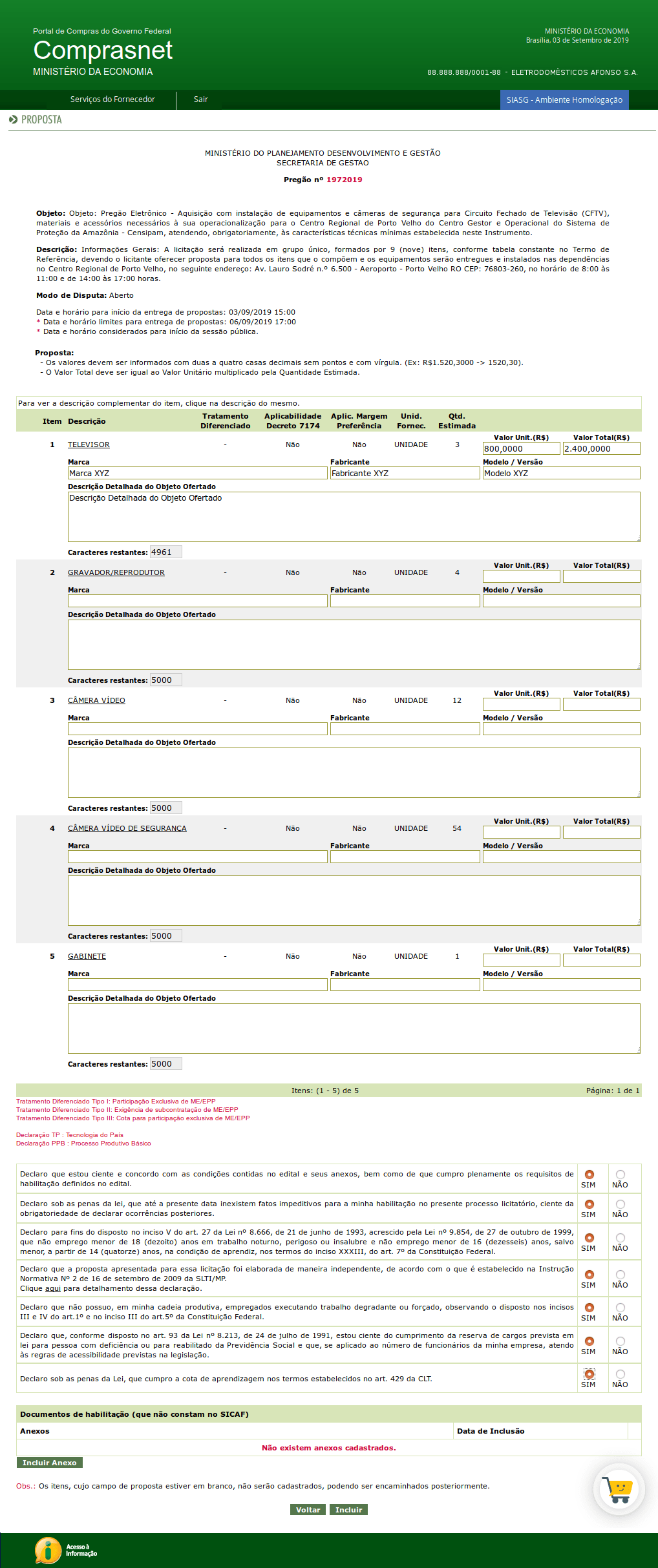 Posteriormente, nesta mesma demonstração, será detalhado o preenchimento dos campos, na elaboração da proposta de um item.