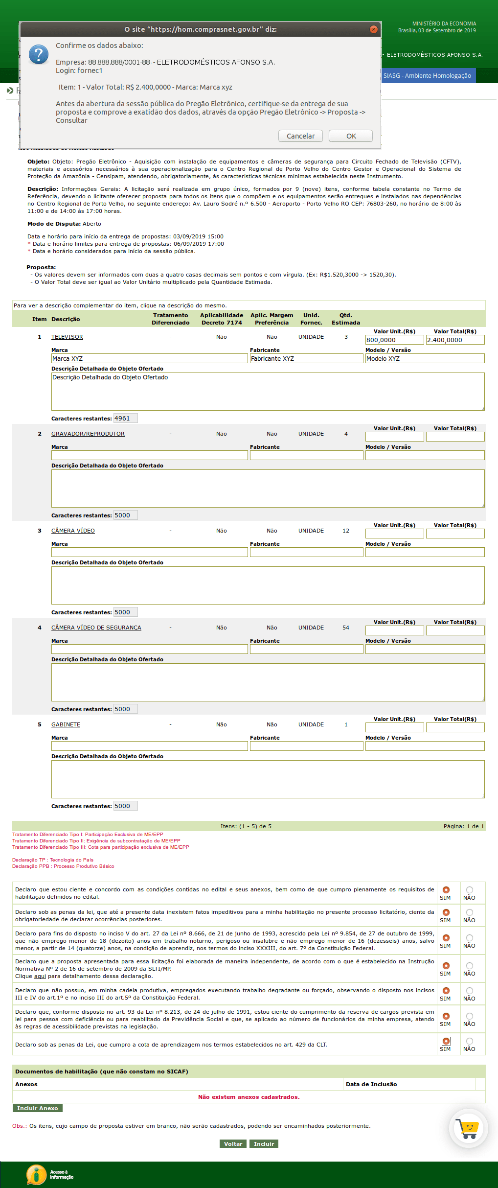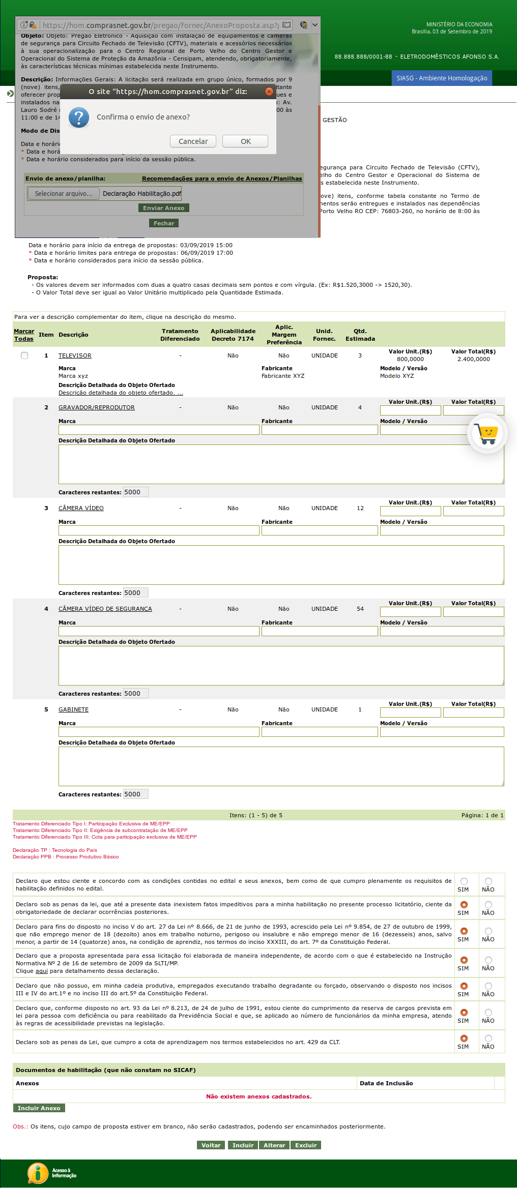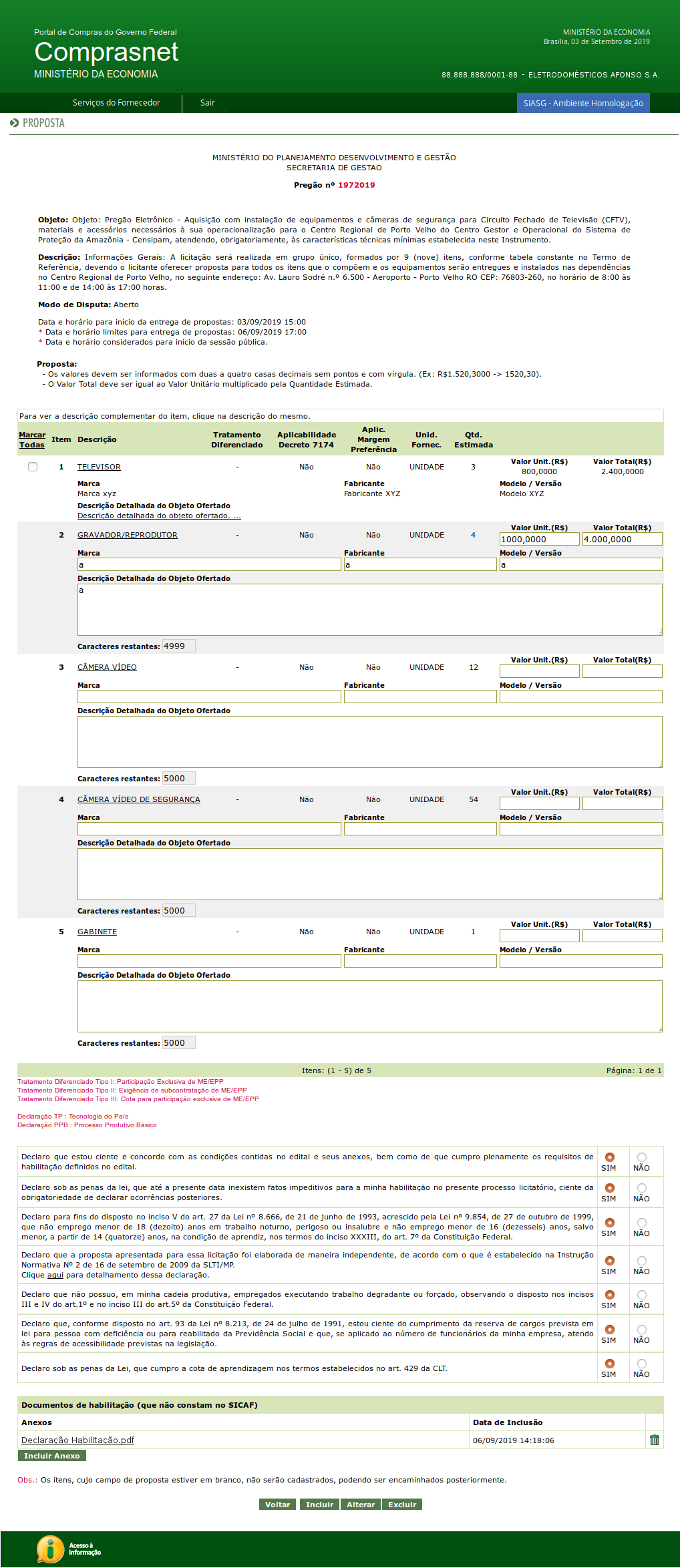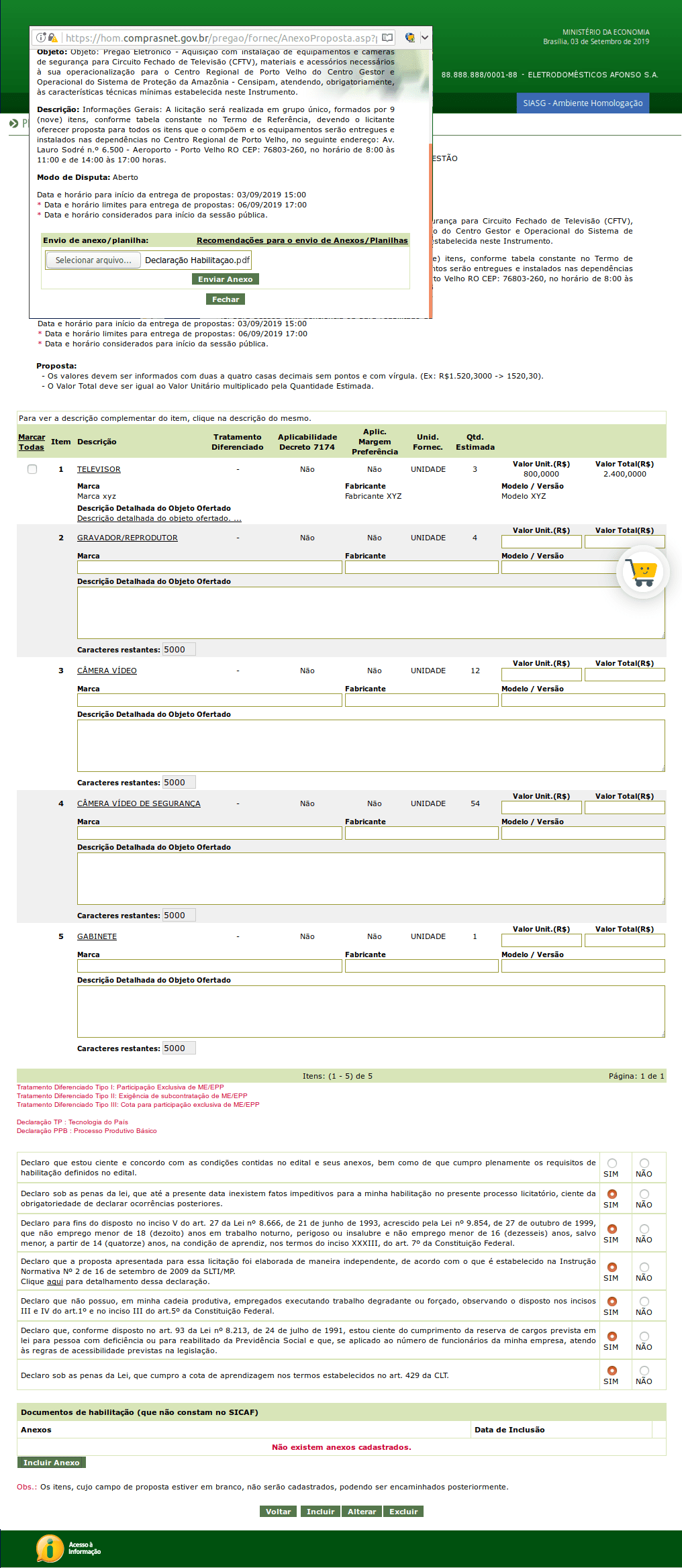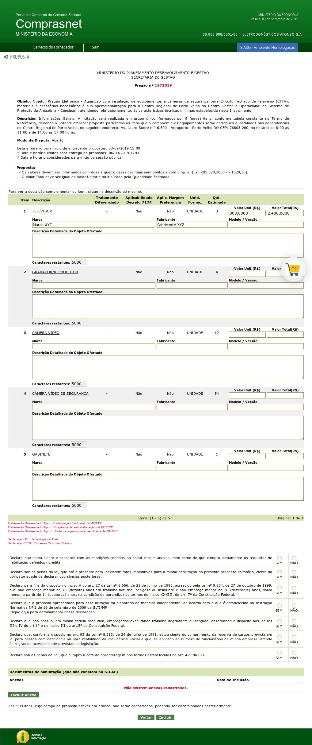 Posteriormente, nesta mesma demonstração, será detalhado o preenchimento dos campos, na elaboração da proposta de um item.