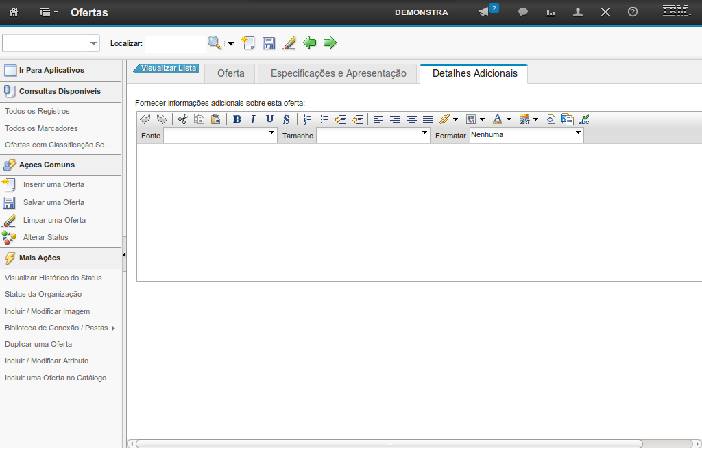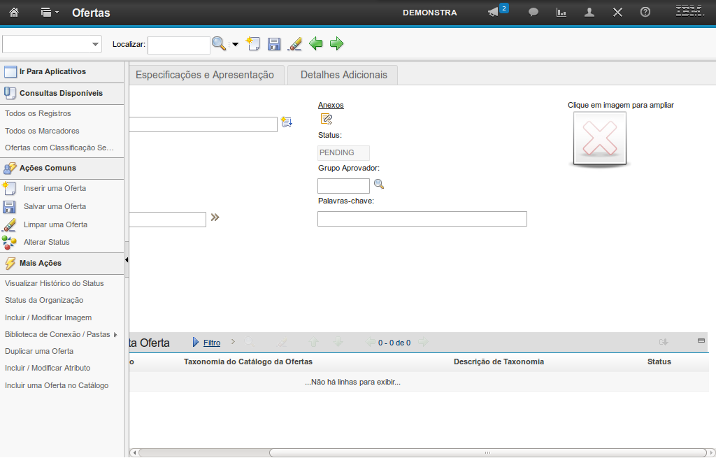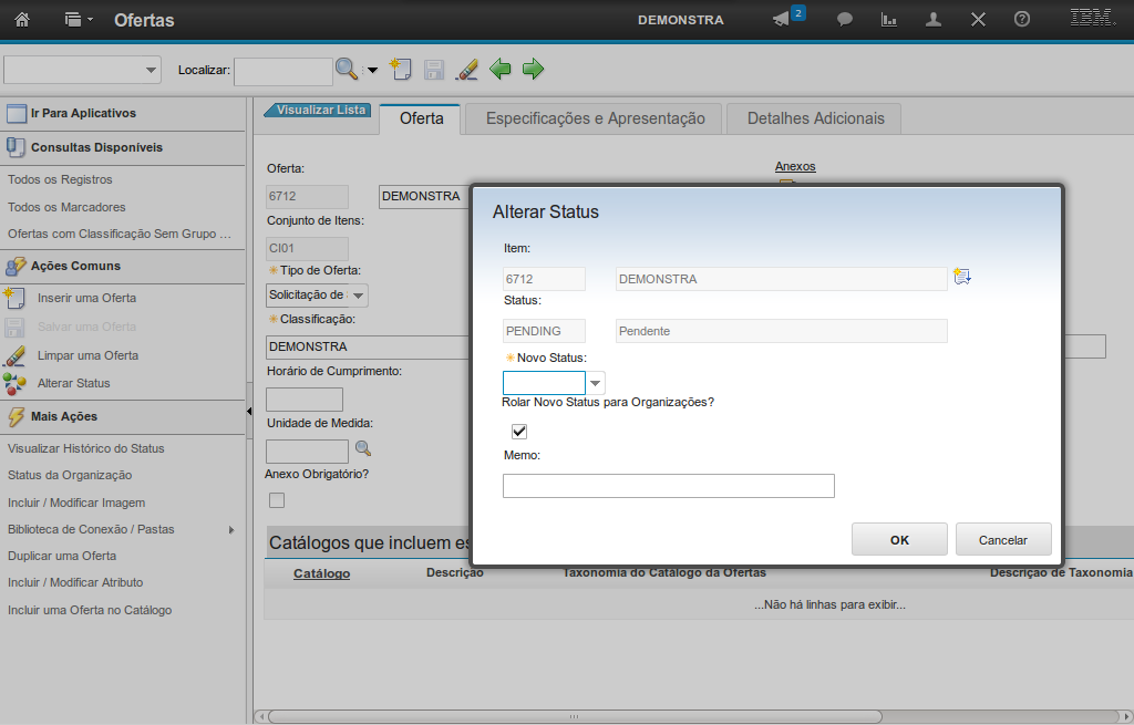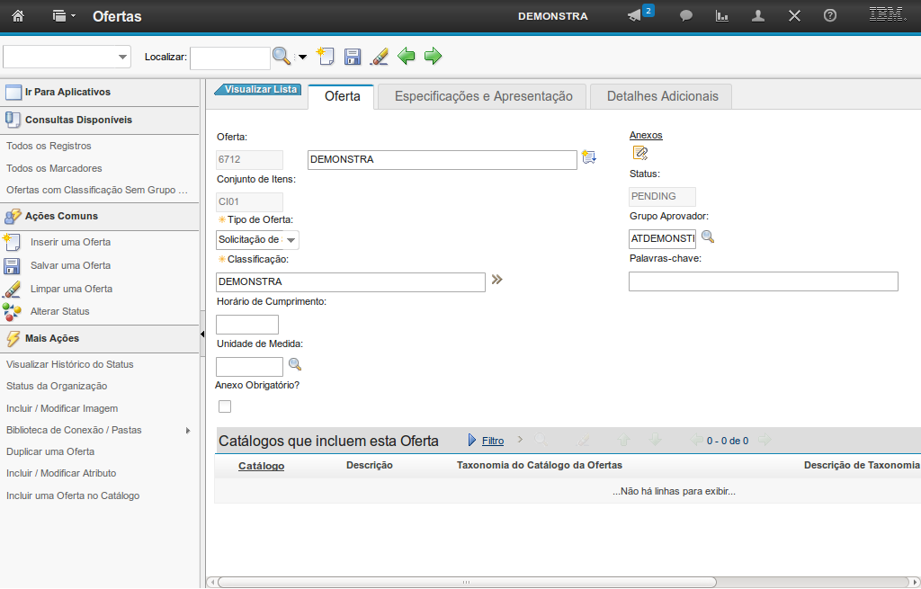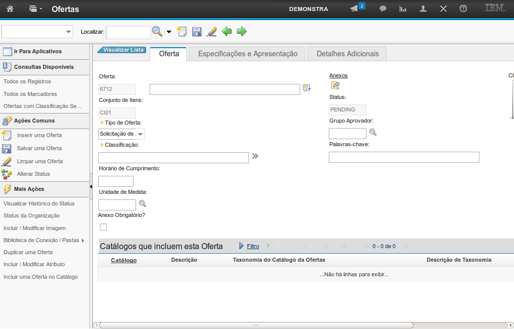 No cadastro de uma nova oferta por meio da aplicação Ofertas, de forma automática, são atribuídos um código identificador único, um conjunto de itens e o status Pendente (esse pode ser alterado no decorrer do ciclo de vida da oferta, por meio da funcionalidade Alterar Status).