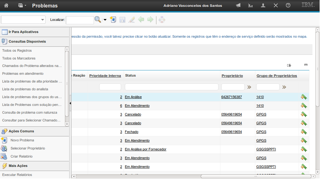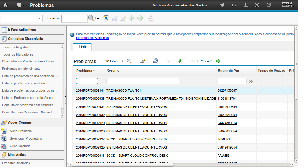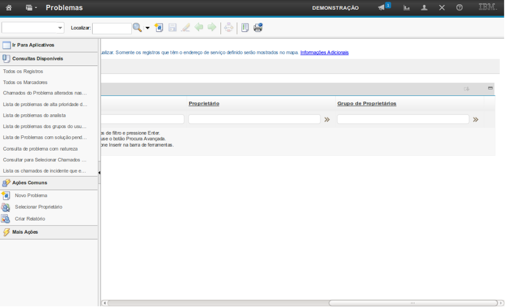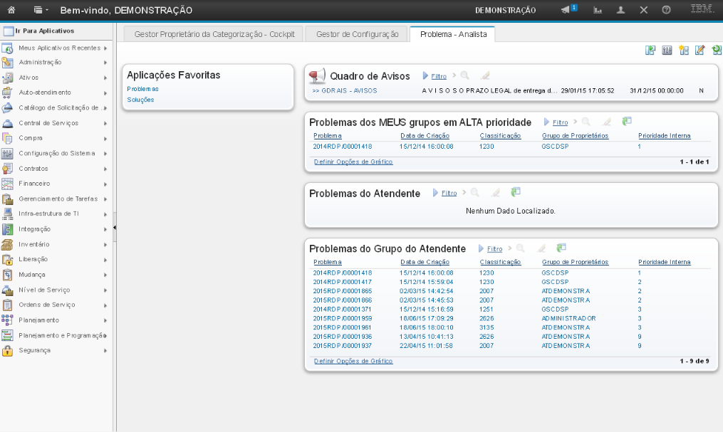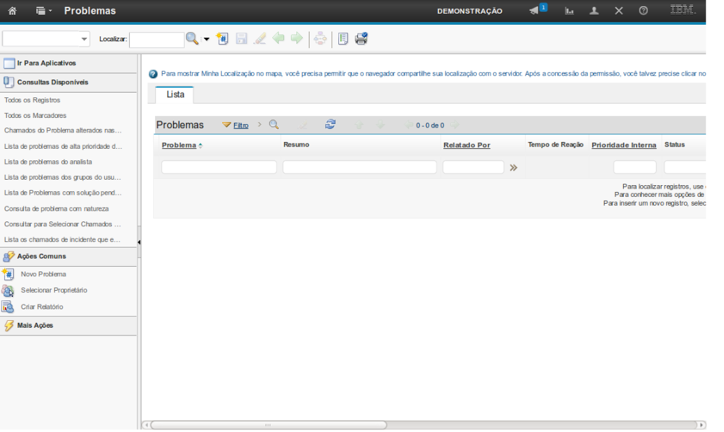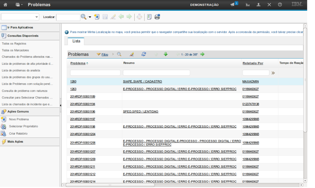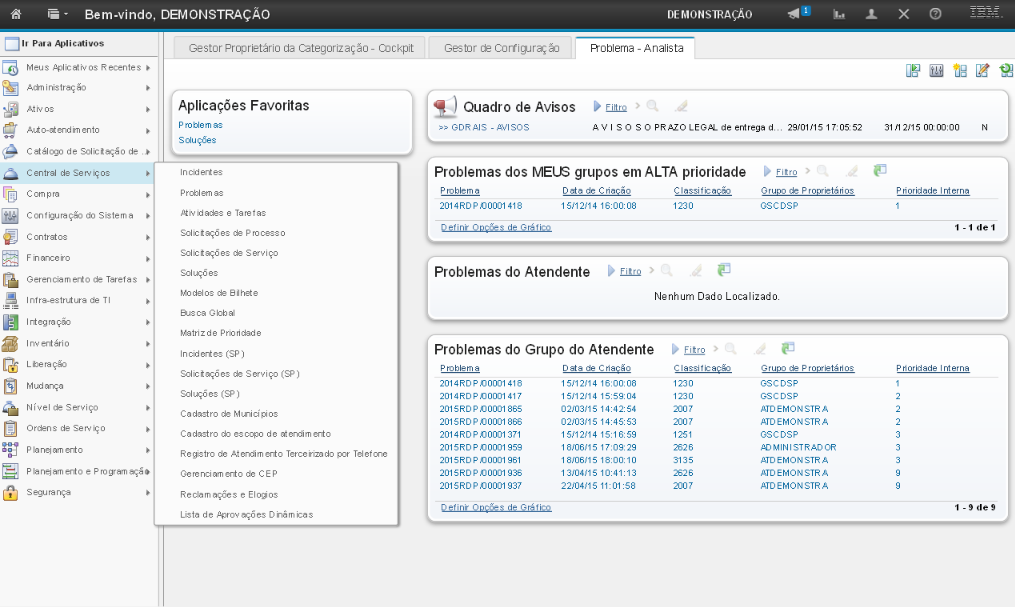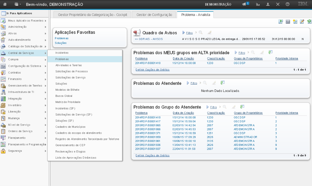 A demonstração se inicia após o login no sistema com o perfil de usuário Gestor de Problema.