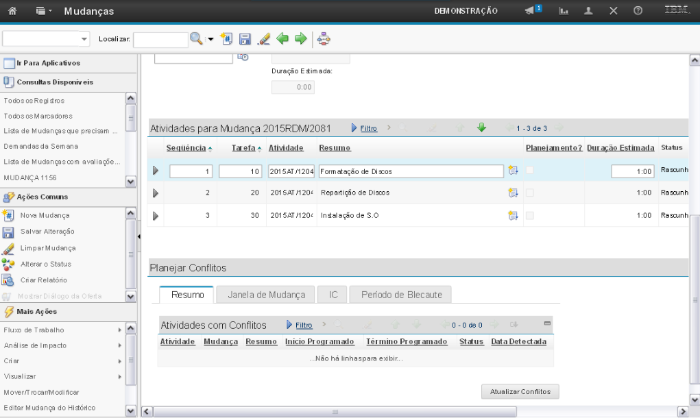 Na Aba IC, é possível visualizar se os Itens de Configuração presentes nas atividades da mudança, serão alterados por outra mudança no mesmo horário.