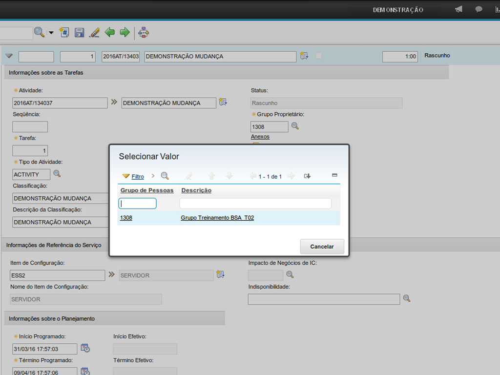 Após escolher a classificação da atividade, o gestor de mudança deve definir o grupo que executará esta atividade.
