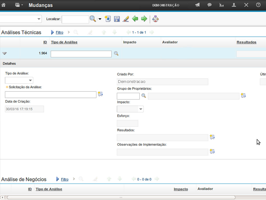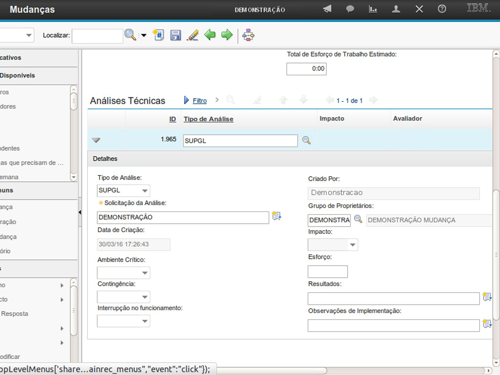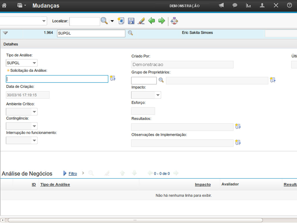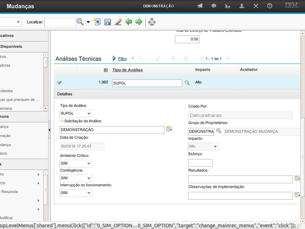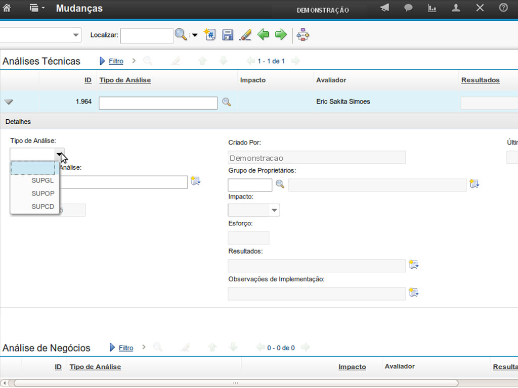 Nesta demonstração iremos selecionar a opção "Encaminhar Mudança para Análise".