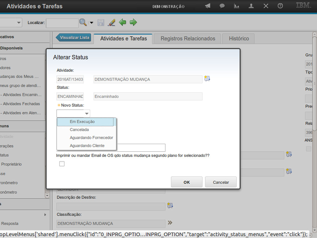 No campo "Classificação" o gestor de mudança deve escolher a classificação da atividade.