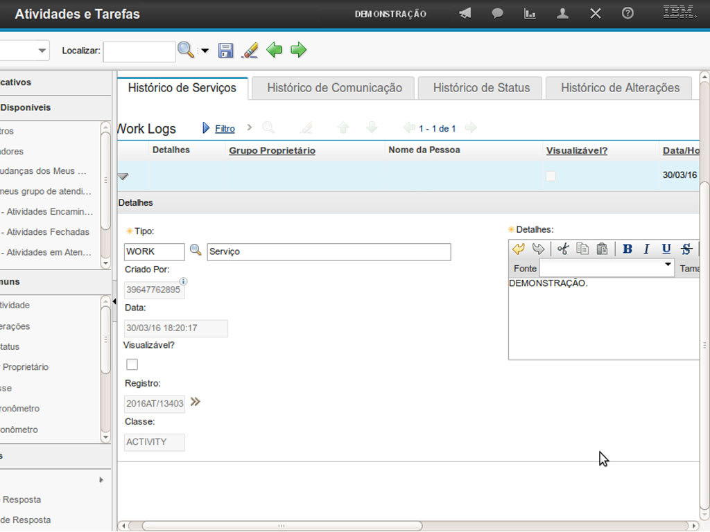 O Gestor deve escolher o tipo "WORK" do histórico para inserir informações sobre a execução da atividade. As informações devem ser escritas no campo "Detalhes".