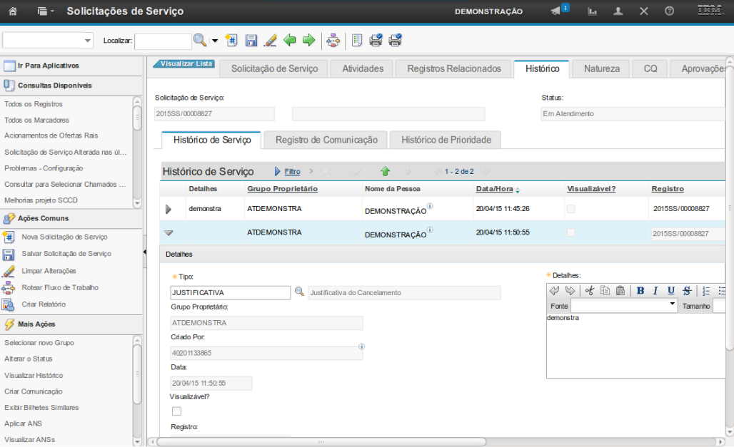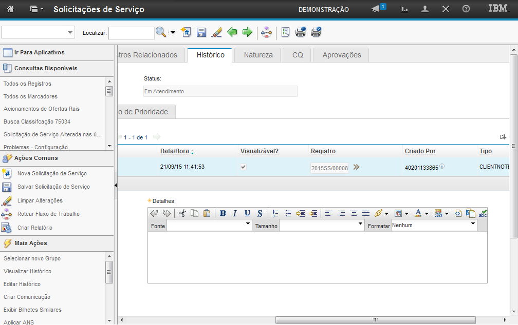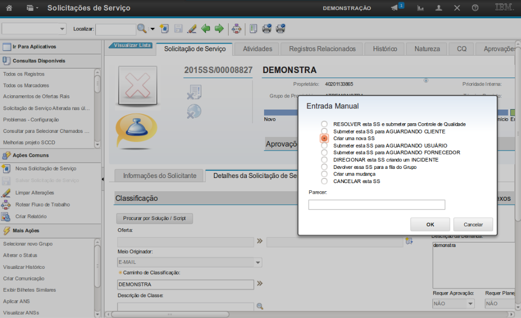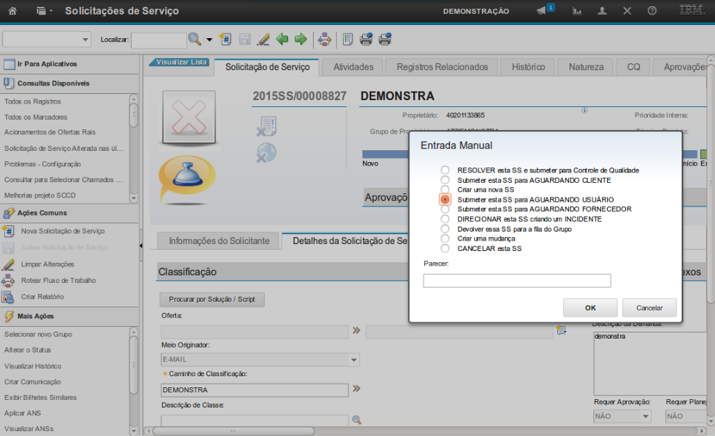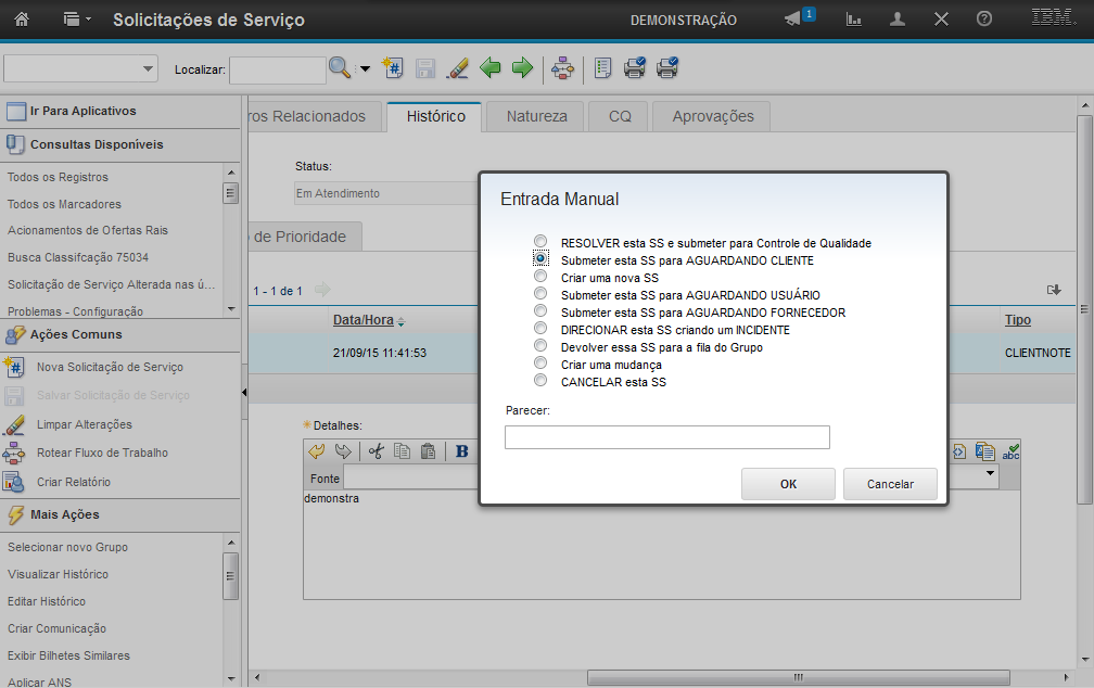 Assim como para a opção "Submeter esta SS para Aguardando Cliente", é necessário inserir um registro no histórico de tipo "Work", com as informações que serão enviadas para o usuário.
