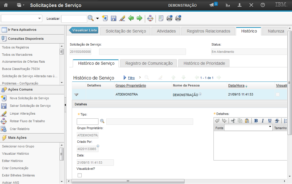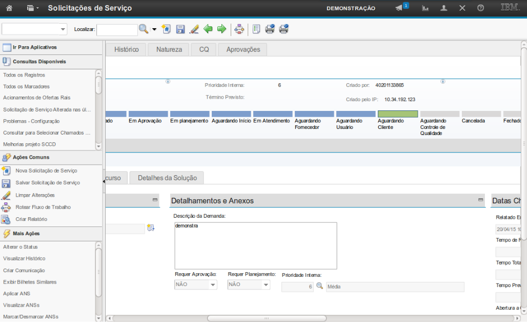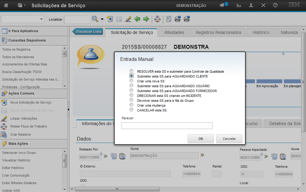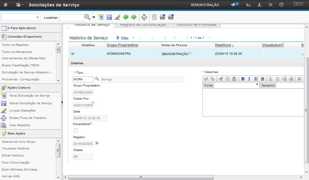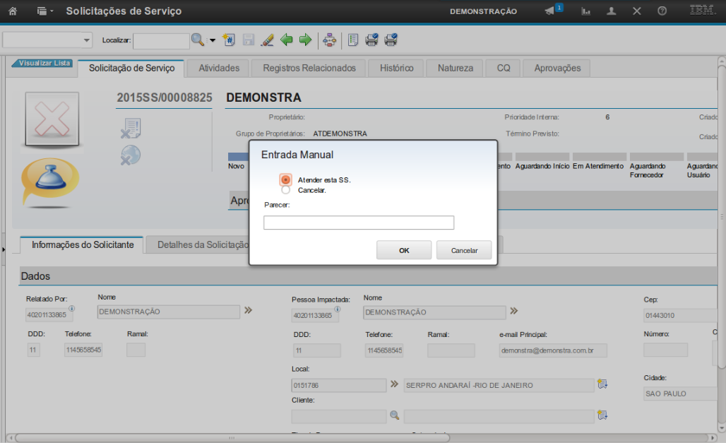 Assim como para a opção "Submeter esta SS para Aguardando Cliente", é necessário inserir um registro no histórico de tipo "Work", com as informações que serão enviadas para o usuário.