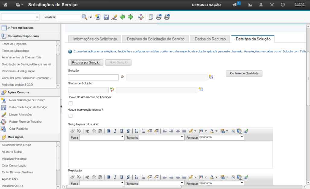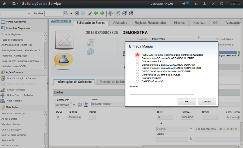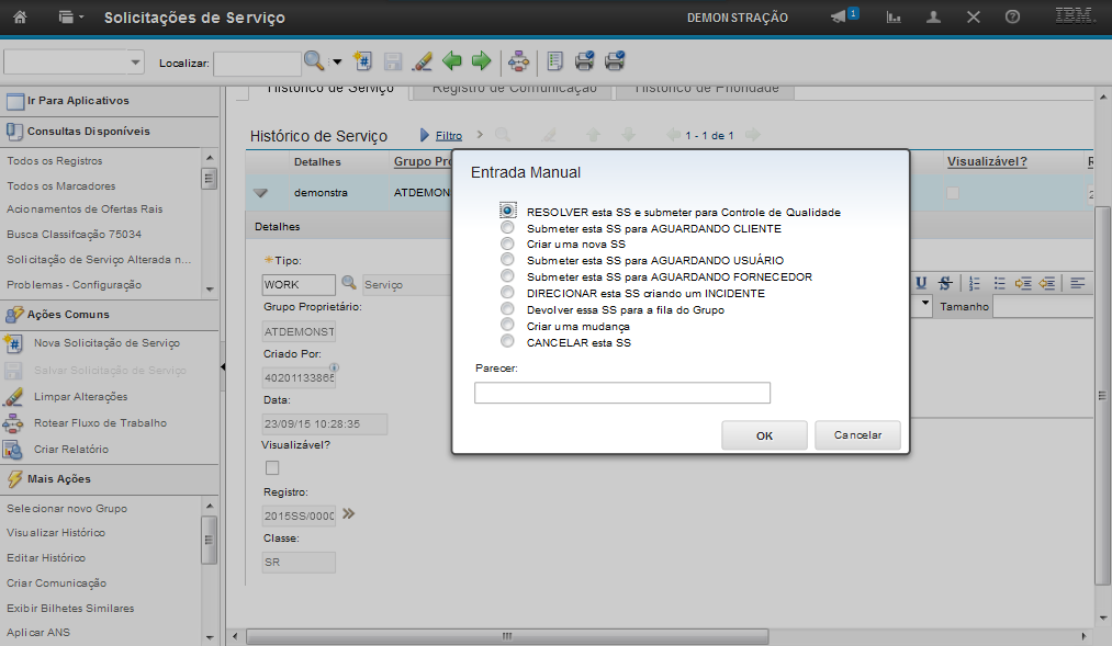 Após inserir o registro do histórico, você deve "Rotear" e selecionar a opção "Resolver esta SS e Submeter para Controle de Qualidade".