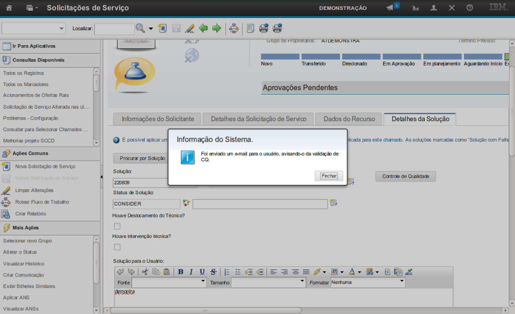 Obs: Após ler a mensagem e selecionar a opção "Fechar", o status da SS passa a ser "Aguardando o Controle de Qualidade". Esse status permanece até o envio do feedback pelo solicitante.