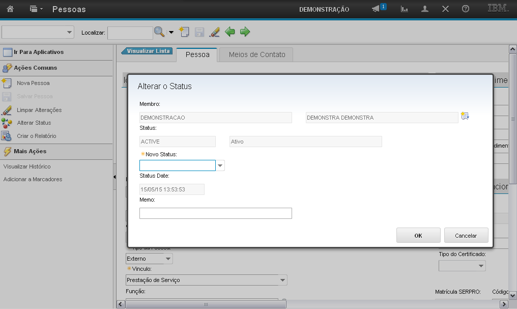 Para alterar o status você deve selecionar a opção "Novo Status". O sistema sempre irá exibir o status contrário ao da pessoa.
