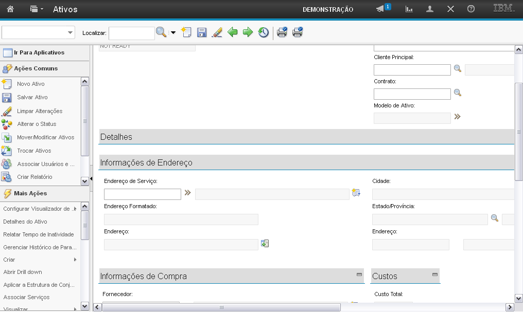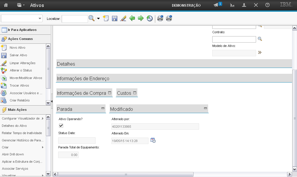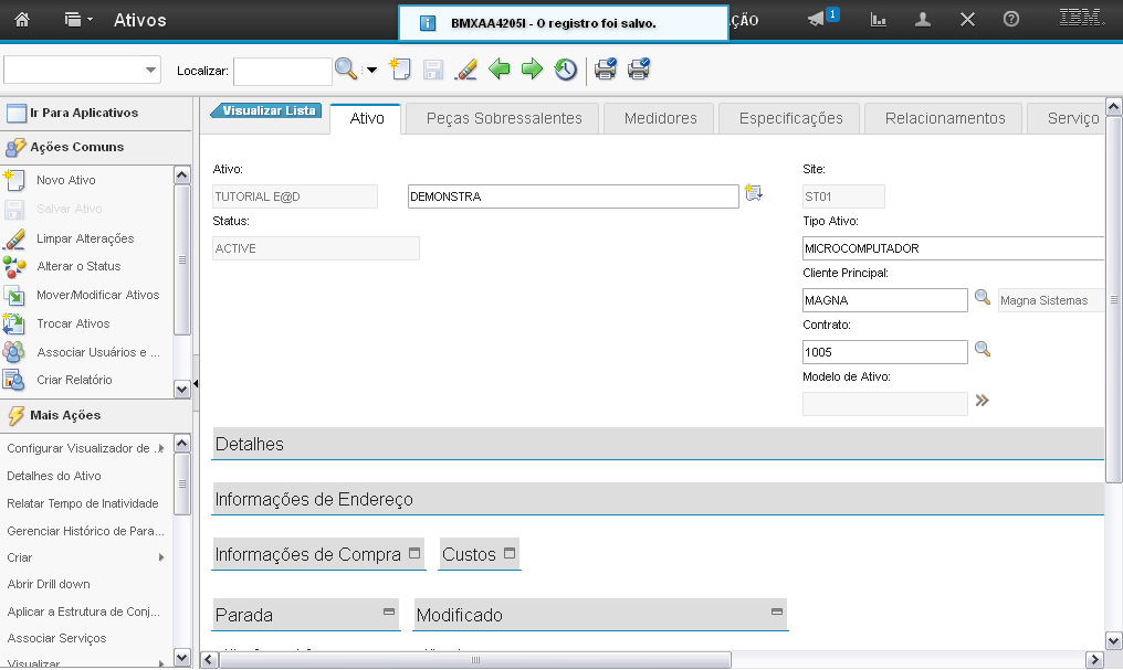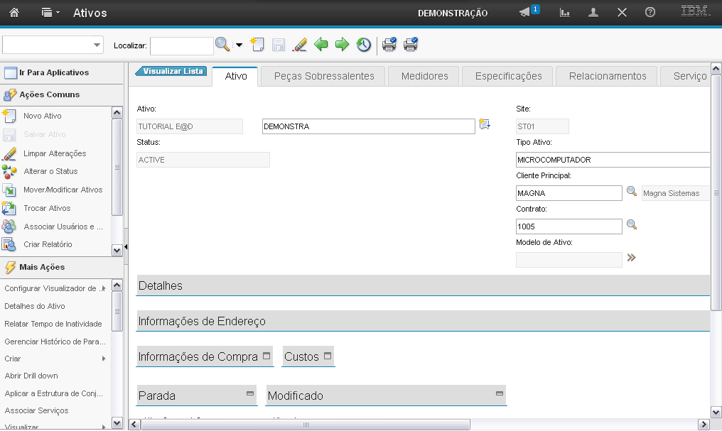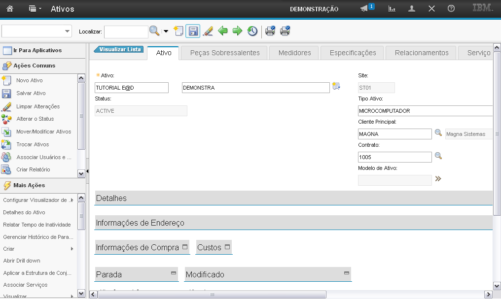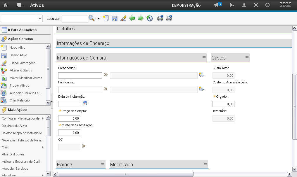 O sistema exibe seções para preenchimento dos campos para criação do Ativo: "Detalhes", "Informações de Endereço", "Informações de Compra", "Custos", "Parada" e "Modificado".