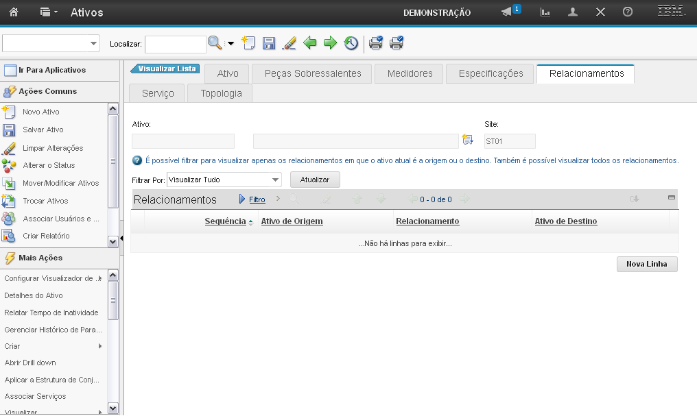 A seção "Relacionamentos" permite que você adicione em "Nova Linha" um ou mais relacionamentos ao ativo.