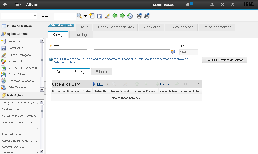 As abas "Ordens de Serviço" e "Bilhetes" exibem as ordens de serviços e bilhetes abertos para esse ativo.