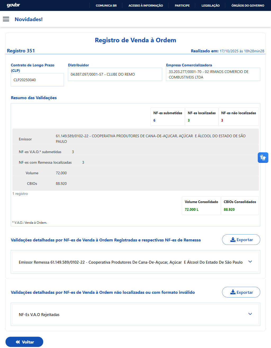 Nesse exemplo o registro foi "Processado com ressalvas", necessitando que o usuário valide as notas do registro de venda à ordem.