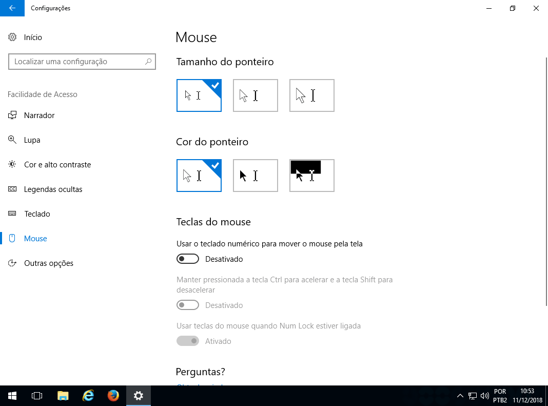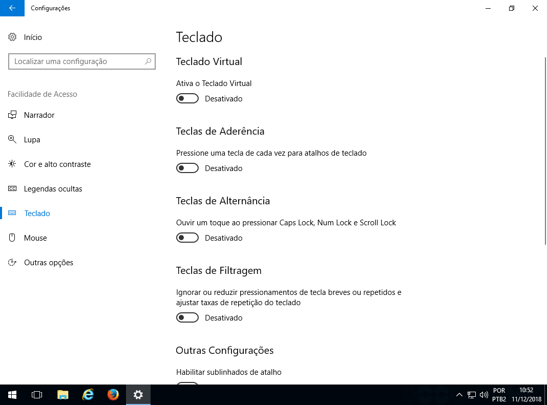 Nas opções de Teclado pode-se ativar Teclas de Aderência, Teclas de Alternância ou o Teclado Virtual.